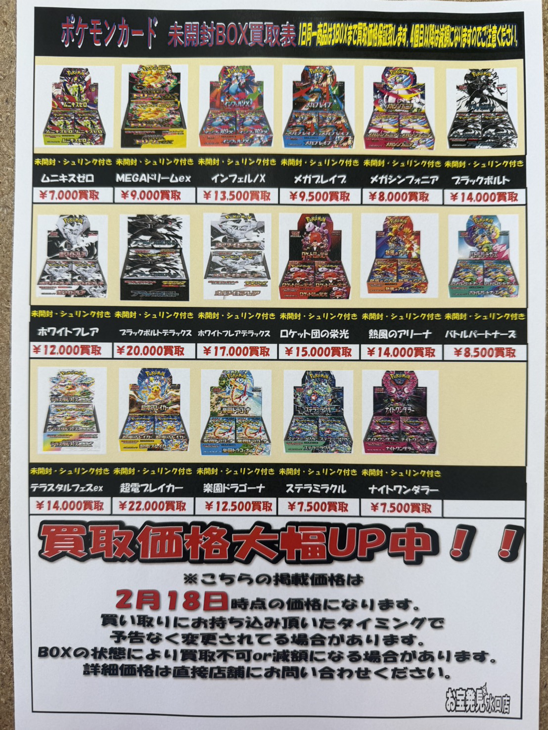 ポケモンカードカードBOX買取リスト更新しました! 買取告知 カード 2026年2月18日 数量限定で買取価格大幅UP中!! 個数が集まり次第掲載価格は終了します。 お早めにお持ち下さいませ! 当店査定基準に満たない商品は買取不可となります。 ※2026/2/18現在の価格となります。 在庫状況などによってお値段が変動いたします。予めご了承ください。 ************************ こちら↓もぜひチェックしてみてくださいね♪(*´▽`*) ・最新のイベント情報はこちら ・最新の買取情報はこちら