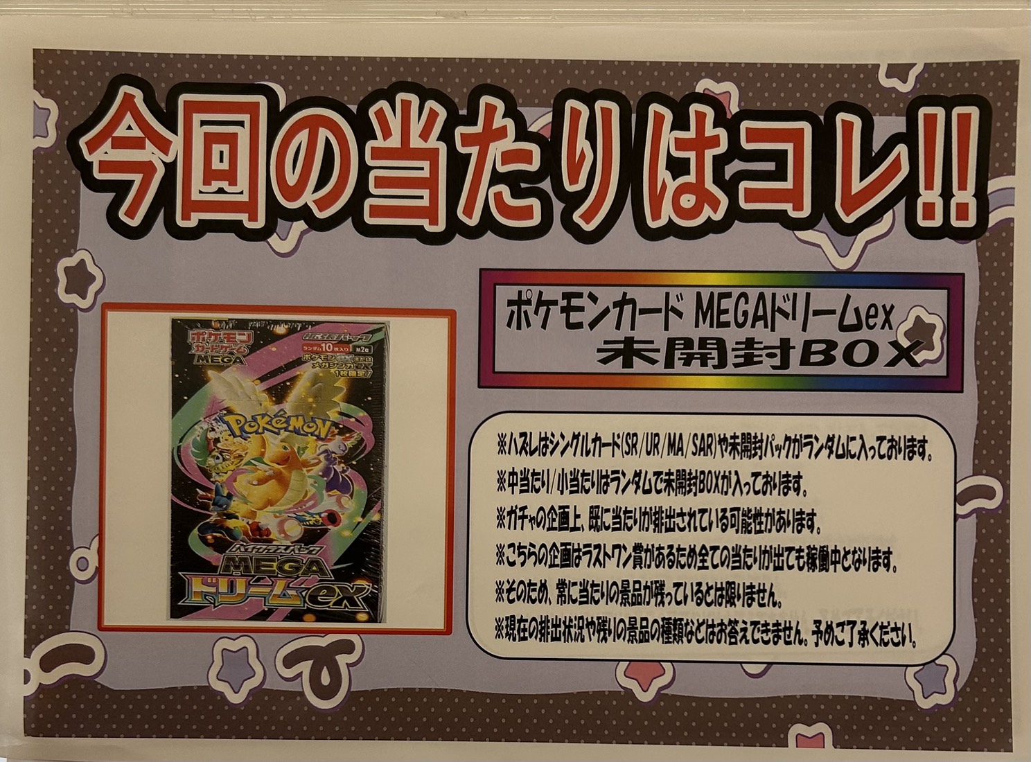売り切れてました 『ポケカUNLOCKロッカーガチャ』 景品補充を行いました❗️ カード ガチャ 2026年3月20日 売り切れてました 『ポケカUNLOCKロッカーガチャ』 景品補充を行いました❗️ 今回の当たりは 「MEGAドリームex未開封BOX」 ラストワンには「サザレ 092/066 SAR PSA10」 をご用意してます! ハズレにはパックやシングルカードが入ってます! ぜひこの機会にチャレンジしに来てください!